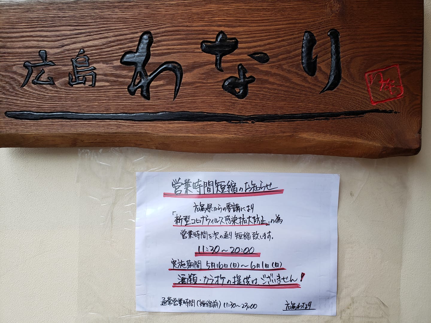 【営業時間短縮】11:30〜20:00 実施機関:5月16日(日)〜6月1日(日)「新型コロナウィルス感染症拡大防止」 2021年5月17日 by masa コメントを書く 営業時間短縮のお知らせ 広島県からの要請により「新型コロナウィルス感染症拡大防止」の為 営業時間を次の通り短縮いたします。 11:30〜20:00 実施機関:5月16日(日)〜6月1日(日) 酒類・カラオケの提供はございません! 通常営業時間(短縮前)11:30〜23:00 <<関連投稿>> 休業のご案内2020年12月17日(水)~2021年1月3日(水)まで新型コロナウィルスの感染拡大防止協力広島県からの要請により、新型コ… 休業のご案内2021年1月4日(水)~2021年1月17日(水)まで新型コロナウィルスの感染拡大防止協力広島県からの要請により、新型コ… 休業のご案内2021年1月18日(月)~2021年2月7日(日)まで新型コロナウィルスの感染拡大防止協力広島県からの要請により、新型コ…