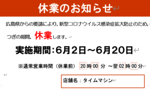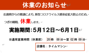 新型コロナウイルス感染症拡大防止に伴う人流抑制の観点から、広島県の要請により 2021年9月13日~9月30日の間を休業させていただきます。 ご理解とご協力をお願いいたします。 タイムマシン 松本元順