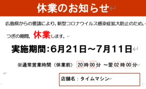 新型コロナウィルスの感染拡大防止のため、広島県の要請に協力するために 2021年5月12日(水)~6月1日(火)までの期間で「カラオケ&DISCOタイムマシン」は休業をいたします。 何卒、ご理解とご協力をお願いいたします […]