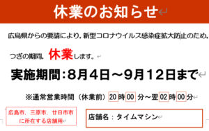新型コロナウイルス感染症拡大防止に伴う人流抑制の観点から、広島県の要請により 2021年8月4日~9月12日の40日間を休業させていただきます。 ご理解とご協力をお願いいたします。 タイムマシン 松本元順
