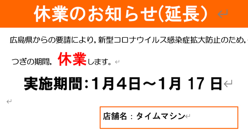 休業のご案内2021年1月4日(水)~2021年1月17日(水)まで新型コロナウィルスの感染拡大 2021年1月4日 最終更新日時 : 2021年5月17日 大内雅司 広島県からの要請により、新型コロナウィルスの感染拡大防止のため、つぎの期間、休業します。 実施期間:2021年1月4日(水)~2021年1月17日(水)まで 何卒、ご理解とご協力をお願いいたします。 カラオケ&DISCOタイムマシン 店主:松本 元順 FacebookXBlueskyHatenaPocketCopy