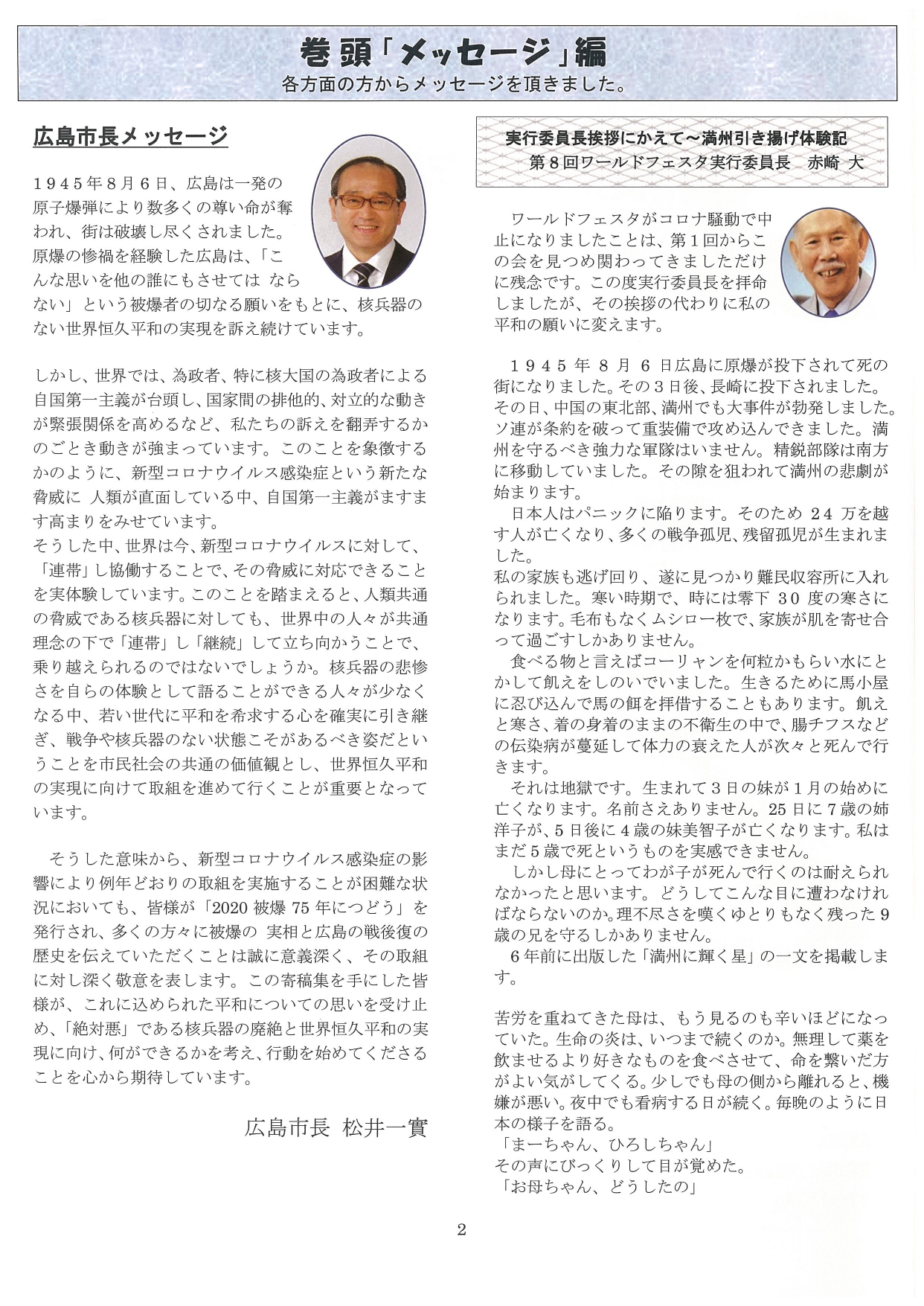 被爆75年のこの年にあたり、これまで「ワールドフェスタ広島」に関わってこられた人たちに”被爆の体験や戦後の体験を通しての思い”や”「平和」についての思い”を寄稿して頂きました。